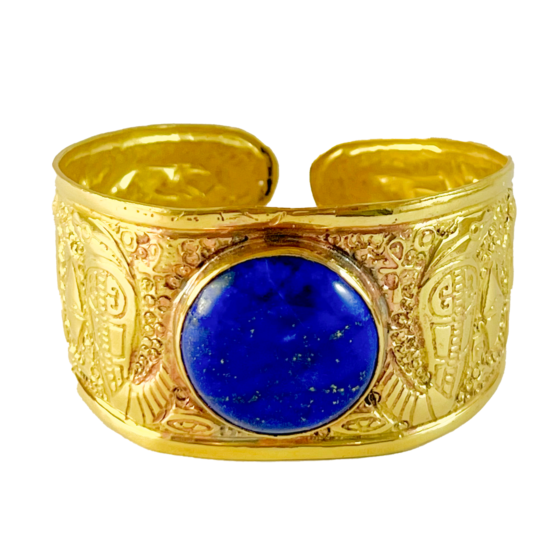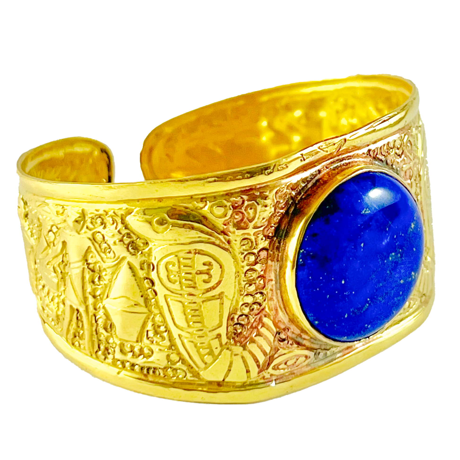 The Blue Lapis Pharaoh Cuff is a bold and beautiful bracelet that combines ancient Egyptian artistry with modern elegance. Handcrafted from brass, this cuff features intricate hieroglyphic engravings and a vibrant blue lapis stone centerpiece. Its design celebrates the timeless sophistication of pharaonic culture while adding a unique touch to your personal style. Ideal for those who love meaningful jewelry that stands out.