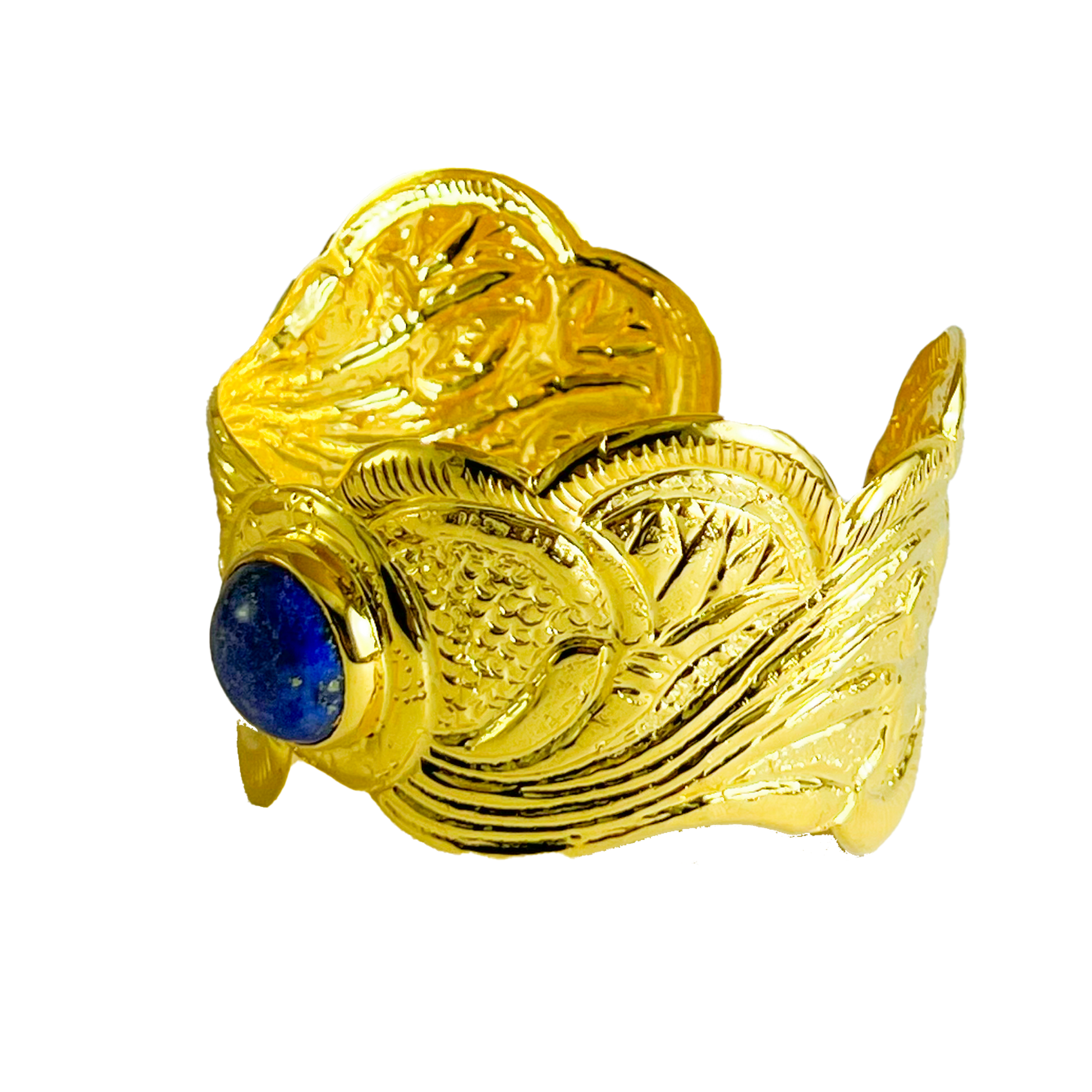 The Blue Nile Feather Cuff is a striking piece of jewelry inspired by the elegance of ancient Egyptian designs. Handcrafted from polished brass, it features intricate feather-like engravings and a bold blue stone centerpiece. This cuff embodies the harmony of nature and craftsmanship, making it a standout addition to your collection. Whether for special occasions or daily wear, it adds a unique and meaningful touch to any look.